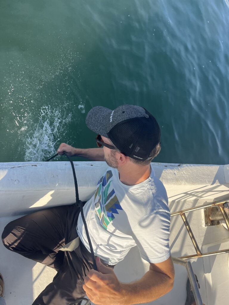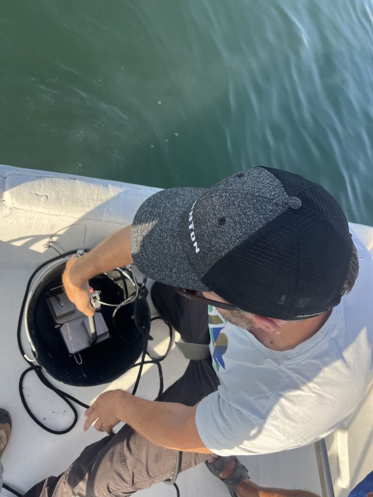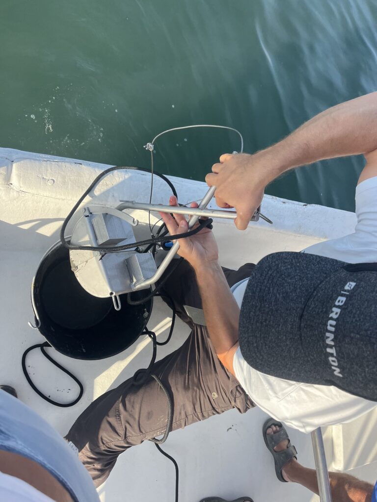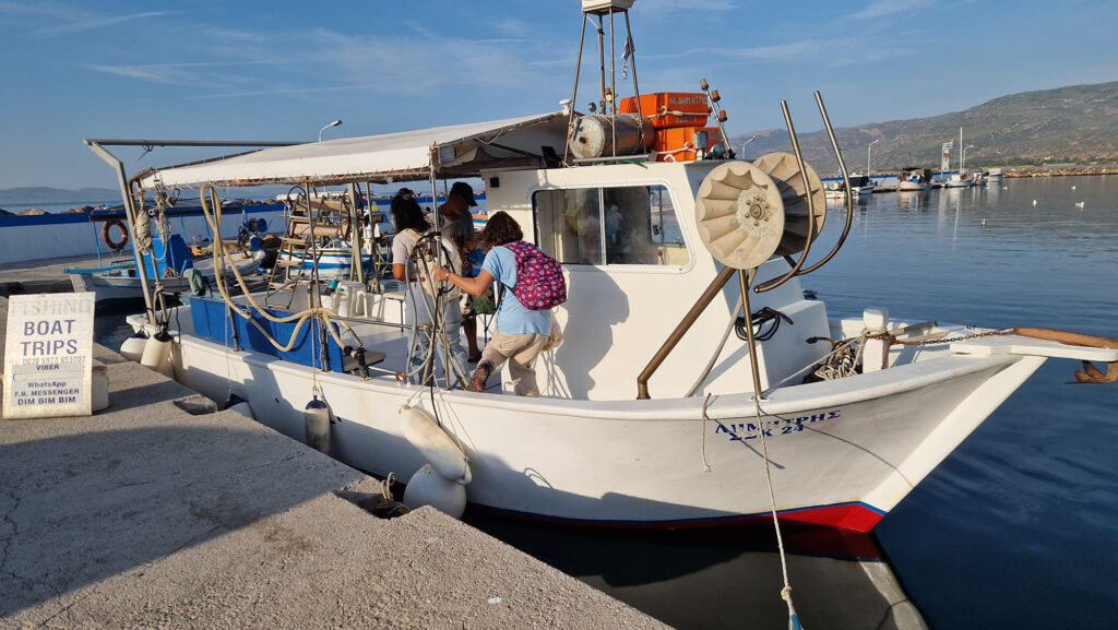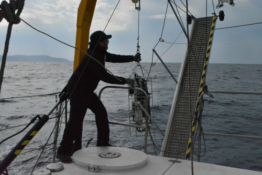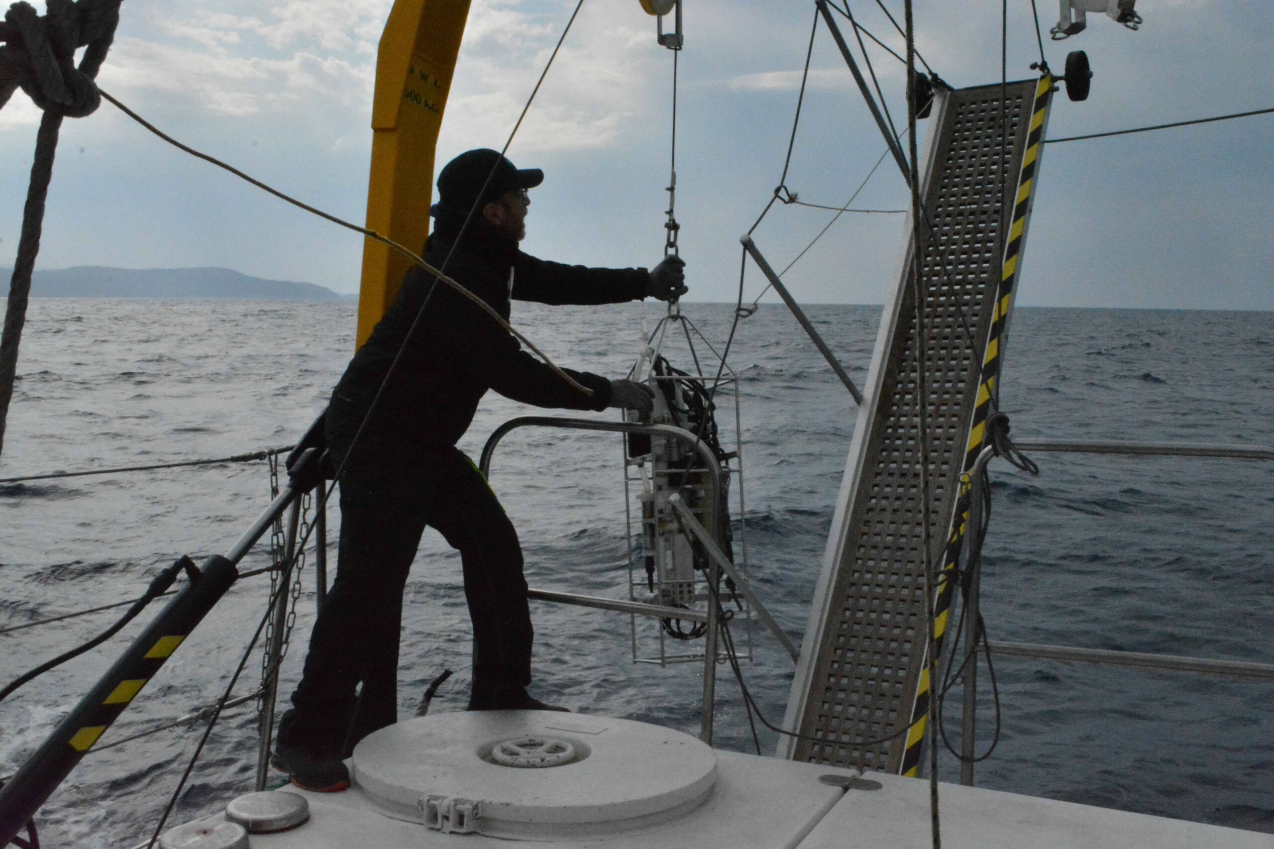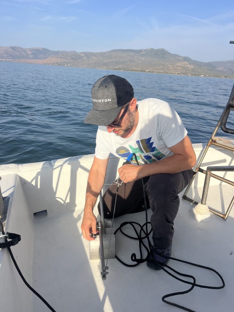 Στο σκάφος για τη διενέργεια των υποθαλάσσιων δειγματοληψιών από τον πυθμένα του Κόλπου της Καλλονής, στο πλαίσιο της εδαφολογικής μελέτης