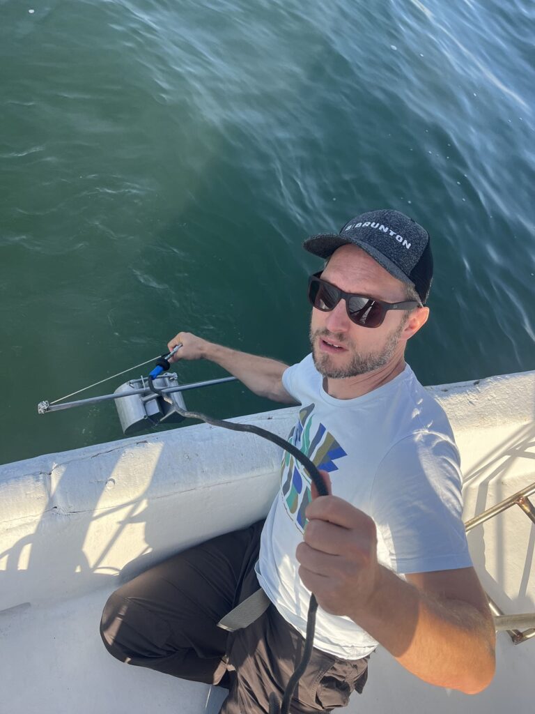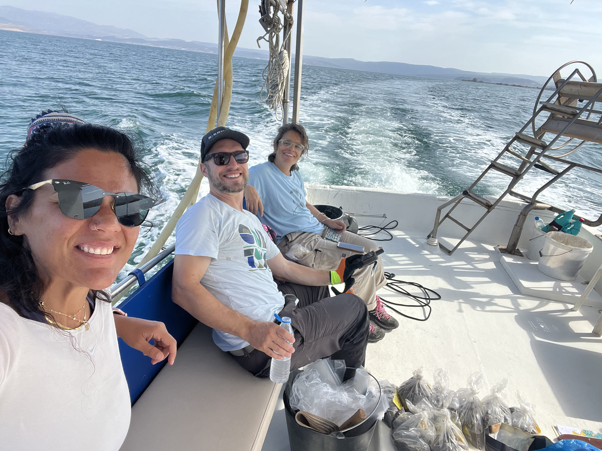 Στο σκάφος μετά την ολοκλήρωση της υποθαλάσσιας δειγματοληψίας στο πλαίσιο της εδαφολογικής μελέτης (από αριστερά προς τα δεξιά Γεωργία Μπέκα, Simon Kübler, Πένυ Τσακανίκου)