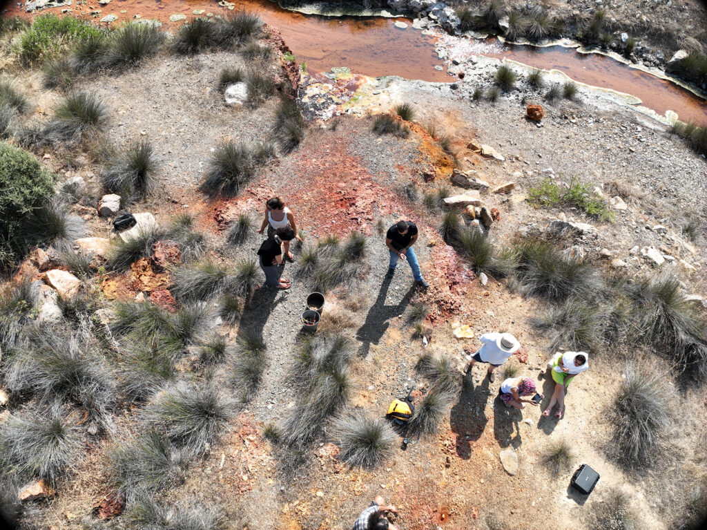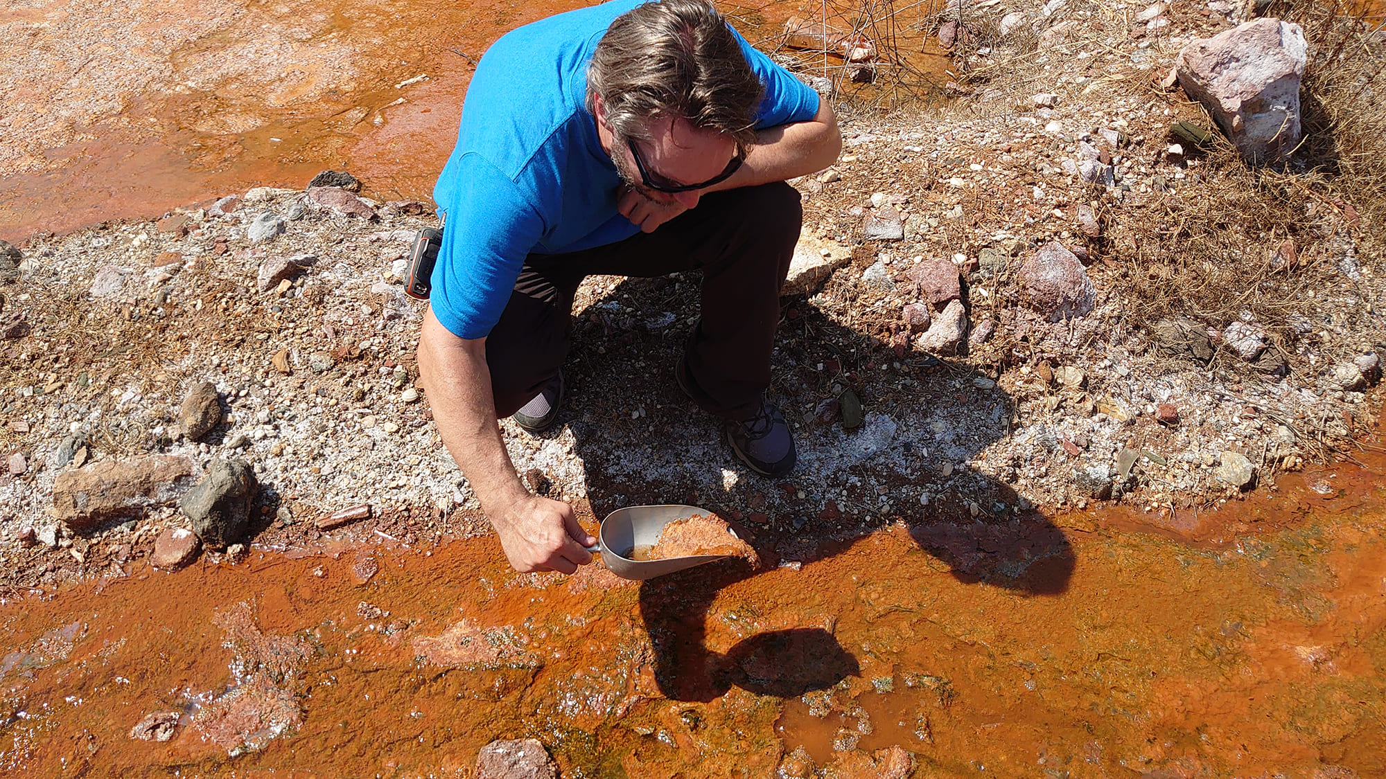 Ο Simon Kübler συλλέγει δείγματα από τη θερμή πηγή στον Πολιχνίτο