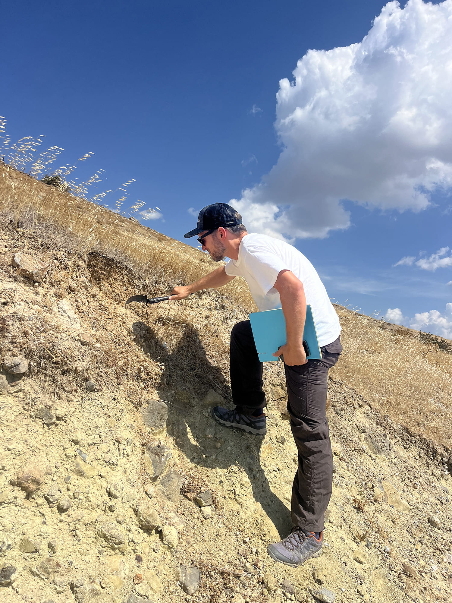 Ο Simon Kübler συλλέγει δείγματα από ηφαιστειακή ενότητα στην κεντρική Λέσβο