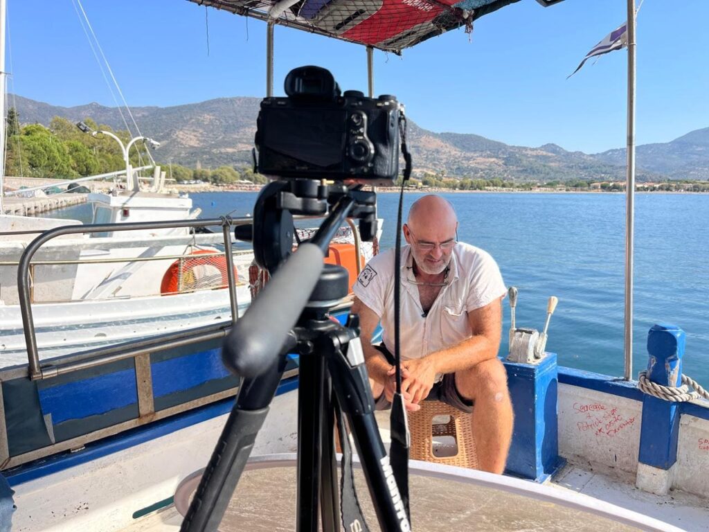 Γυρίσματα για το ντοκιμαντέρ. Συνέντευξη με τον κ. Δημήτρη Κουλαρά, ψαρά που δραστηριοποιείται στον Κόλπο της Καλλονής με καταγωγή από το Λισβόρι