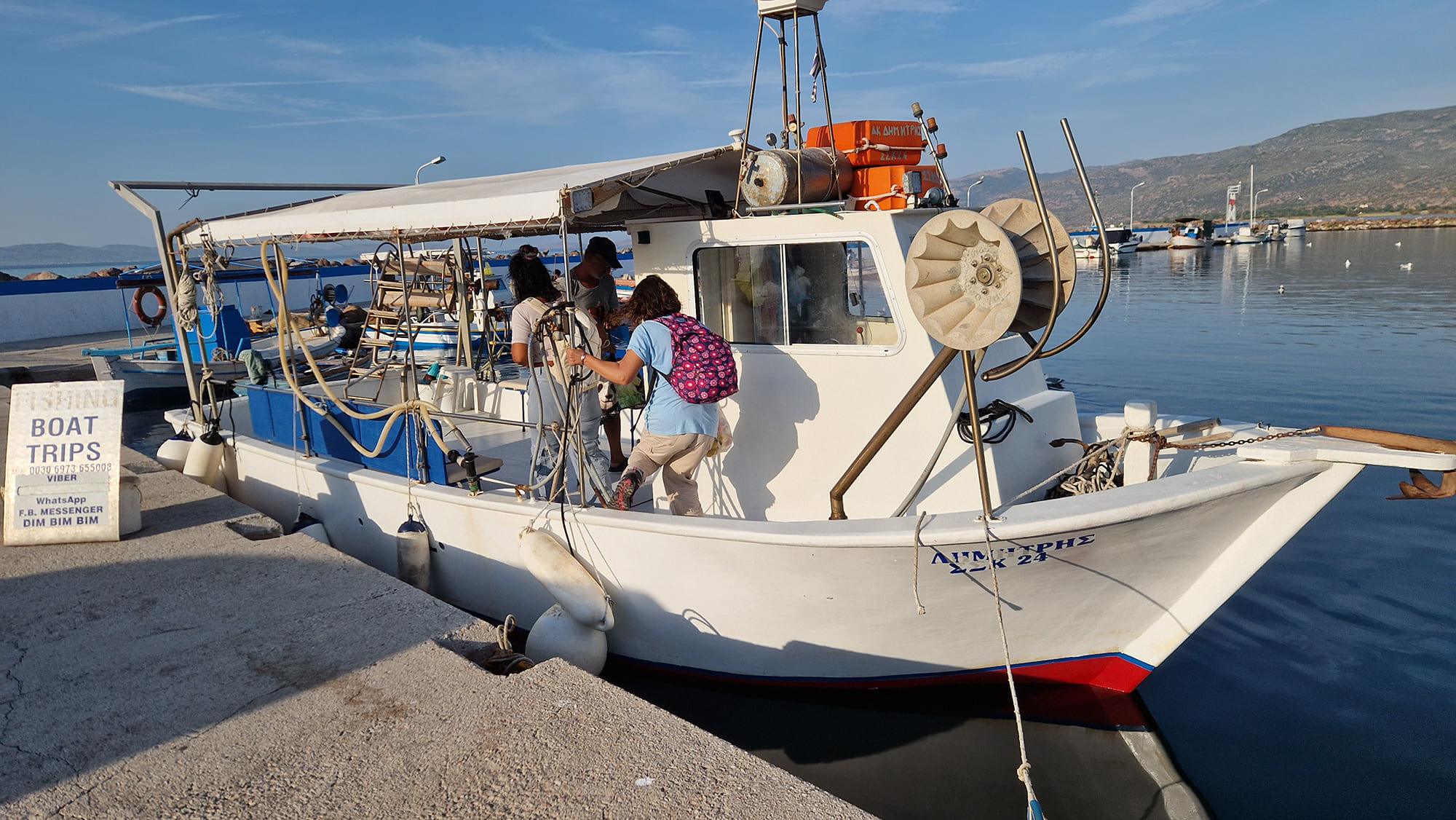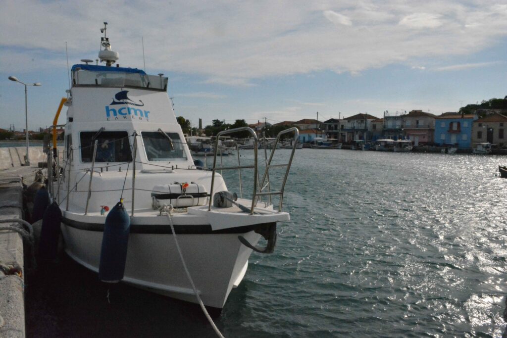 Το εξειδικευμένο σκάφος του ΕΛΚΕΘΕ στο λιμάνι της Σκάλας Πολιχνίτου, στον μυχό του Κόπου της Καλλονής